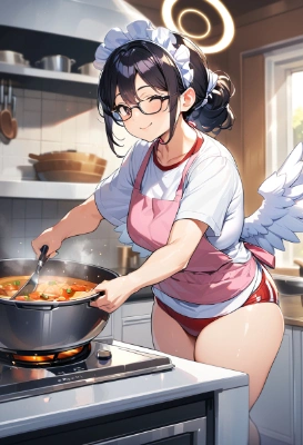 woman, blonde, gal, blue eyes, smile, angel halo, white big wings, white T-shirt, buruma, apron, shiny thighs, ruffle headdress, mansion kitchen, cooking,,