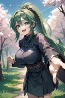 masterpiece, best quality, extremely detailed, anime, girl, skirt <lora:flat2:0> <lora:hairdetailer:1> , lying down, laughing, panty shot, hot spring, colorful, perspective, younger sister, green eyes, green hair, garter belt, ponytail, wet hair, girl, rainy day, rain, summer,look back,tank top,big breasts,,,