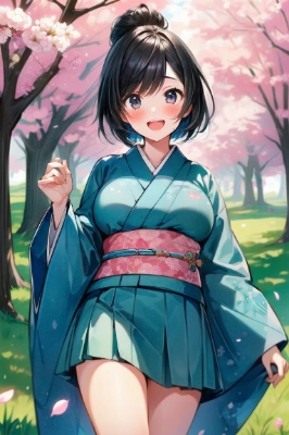 masterpiece, best quality, extremely detailed, anime, girl, skirt <lora:flat2:0> <lora:hairdetailer:1> , standing, laughing, happy, forest, spring, clear sky, colorful, foreshortening, younger sister, my child, original character, green eyes, green hair, ponytail, longhair, girl,ninja combat uniform,big breasts,,