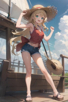 masterpiece, best quality, extremely detailed, anime, a boy, short, baby face, smugness, blonde hair, (1 braids), green eyes, straw hat, (red colored sleeveless shirt), jean shorts, sandals, hands up, raise both arms, clenched fist, (standing with your legs shoulder-width apart), on the ship deck, medieval sailing ship, blue sky, sea, straw hat luffy, midde ages, Age of Discovery <lora:saturation:1> <lora:yawanuri:1> ,