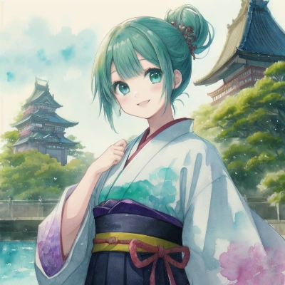 masterpiece, best quality, highres, 1otoko no ko, solo, samurai costumes, tabi, zori, princess, かわいい, flat chest, aqua hair, aqua eyes, half updo, smile, 16 yo, Fantasy makeup, japanese castle, watercolor<lora:flat2:0> <lora:hairdetailer:0.5>