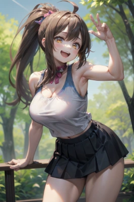 masterpiece, best quality, extremely detailed, anime, girl, skirt <lora:flat2:0> <lora:hairdetailer:1> , standing, laughing, happy, panty shot, sunny day, sweating, spring, forest, clear sky, colorful, foreshortening, big sister, original character, older sister, blue eyes, blue hair, ponytail, longhair, ahoge, a pretty woman,bodybuildng, tank top, big breasts, thick arms, thick neck, upper body,,