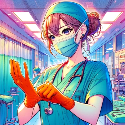 Companion: The focus is entirely on the surgeon. Her expression is one of calm determination,her eyes fixed on the task at hand,reflecting her deep concentration and the seriousness of her upcoming responsibilities.,