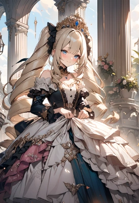 (8K, best quality, master piece: 1.2), super high resolution,14yo,Marie-Antoinette,ultra-detailed face,detailed eyes,blonde hair,long hair,drill hair,blue eyes,rococo frill dress, rococo dress, baroque dress, intricate fantasy dress, ornate ruffle y dress, romantic dress, ruffle y outfit, fantasy dress, ruffles, formal wear, fancy fashion, long sleeve dress, many layered dress, palate colors include pink and white,(pink:1.5),class A smiling face,long skirt dress,gold tiara, necklace, inside Victoria Palace, holding her skirt and bowing slightly