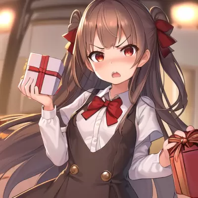 extremely detailed CG illustration, extremely best quality, extremely detailed whole body, (extremely detailed a girl:1.3),(shy:1.1), turn away, (give a gift: 1.1),brown hair, long sailor dress, double tooth, A little angry,student, (red face:1.1), at school,