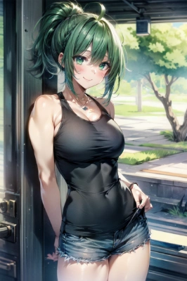 masterpiece, best quality, extremely detailed, anime <lora:flat2:0> <lora:hairdetailer:1> , standing, smiling, blushing, sunny day, castle, spring, colorful, princess, big sister, original character, green eyes, green hair, ponytail, longhair, ahoge, a pretty woman,Tall height, broad shoulders, thick arms, thick neck, big muscles, bodybuilding,,
