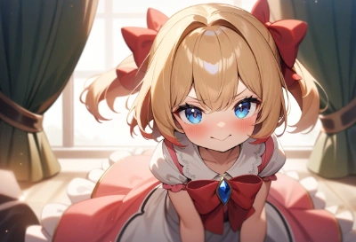 1little girl, loli,short blonde hair, blue eyes, (hair bow:1.2),red bow,red hair bow, (wearing cute princess dress:1.2), looking at viewer, making smug cute face, fancy room, sunbeam, feeling like a princess, (masterpiece:1.2), (best quality:1.3), (very aesthetic:1.2)