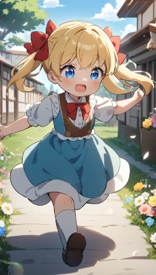 1girl, blonde hair,short hair,, blue eyes, red ribbons, (hair bow:1.3),red bow,walking to school, May weather, looking tired, thinking school is a drag, sunny street, spring trees blooming, students chatting, (masterpiece:1.2), (best quality:1.3), (very aesthetic:1.2)
