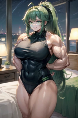 masterpiece, best quality, extremely detailed, anime <lora:flat2:0> <lora:hairdetailer:1> , blushing, smiling, colorful, foreshortening, younger sister, my child, original character, green eyes, green hair, ponytail, ahoge, girl,bodybuilding, tank top, hot pants, big muscles,,
