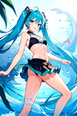 masterpiece, best quality, extremely detailed, anime, girl, 1girl, hatsune miku, vocaloid,Anime illustration: Set against the expansive blue of the coral reef cave, a high girl with a high is swimming. Her black and white metallic bikini, adorned with a floral pattern and frills, stands out. Bubbles and the dance of light refractions enrich the scene.,longhair,tail,Witch,al girl,whale,sea,Princess,Twintails,mini skirt,fantasy,masterpiece, best quality, extremely detailed, anime, girl, skirt1girl, hatsune miku, vocaloid, masterpiece, best quality, extremely detailed, anime, girl, skirtmasterpiece, best quality, extremely detailed, anime, girl, skirt(hatsune miku:1.1)(1girl,solo,loli:1.2), (masterpiece:1.3),(best quality:1.3), white Clothes,frilled bikini, bikini skirt, an extremely delie and beautiful,smile,(arms up:0.5),ry , at ,Side Tail,fantasy,longhair,mini skirt,Twintails,Rubber,blue ,clear ,sea,castle