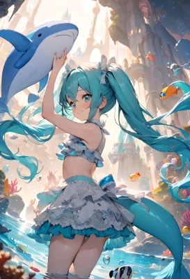 masterpiece, best quality, extremely detailed, anime, girl, skirt1girl, hatsune miku, vocaloid, masterpiece, best quality, rating: general, newest,blue hair,green hair,blue eyes,Princess,Twintails,princess,fantasy,butterfly,flower,castle