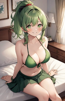 masterpiece, best quality, extremely detailed, anime, girl, skirt <lora:flat2:0> <lora:hairdetailer:1> , standing, blushing, smiling, night, colorful, big sister, green eyes, green hair, ponytail, longhair, a pretty woman,nightgown, big breasts, bedroom,,