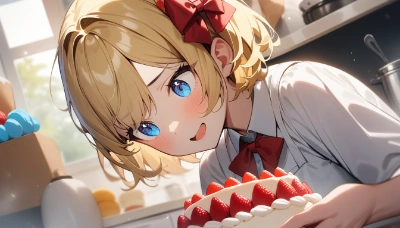 1girl, blonde short hair,(hair bow:1.4),red bow,short hair,blonde hair, blue eyes, red ribbon in hair, decorating cake, kitchen counter, piping bag, colorful frosting, focused expression, afternoon sunlight, feeling creative, (masterpiece:1.2), (best quality:1.3), (very aesthetic:1.2)