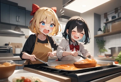 1girl with blue hair, blue eyes, blue ribbon, sitting in retro cafe, drinking coffee, waiting for someone, girl with blonde hair, blue eyes, red ribbon, short hair enters, sunny afternoon, jazz music playing, nostalgic atmosphere, warm lighting, anime style,(masterpiece:1.2), (best quality:1.3), (very aesthetic:1.2)