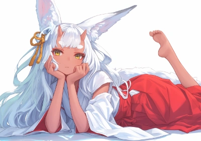 pencil drawing, fade out, full body, killer queen, beautiful cute dark-skinned girl, japanese miko clothes, silk texture, black undershirt, white hair, fox ears, thick eyebrows, barefoot, imaginary lighting, white background, --ar 24:17 --niji 6