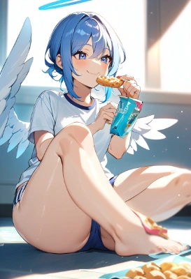 woman, blue hair, androgynous, shy, smile, angel halo, white big wings, white T-shirt, buruma, shiny thighs, bedroom, holding a stuffed animal