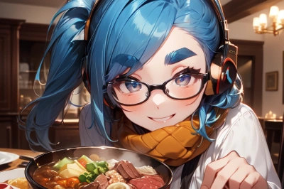 glasses, thick eyebrows, short eyebrows, droopy eyes, headphones, scarf, blue hair, side ponytail,