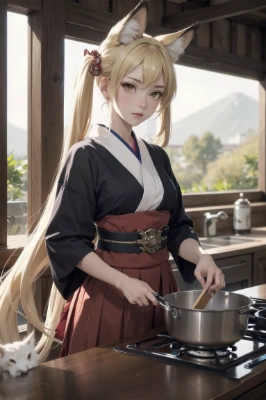 masterpiece, best quality, extremely detailed, anime, girl, skirt, Cooking, a pretty woman, bobcut, red hair, red eyes, shrine maiden, fox girl, colorful, steampunk(The beastman, the fox, is cooking. He is happily making his favorite fox udon.),