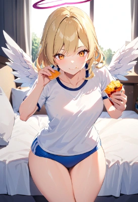 woman, blue hair, androgynous, angel halo, white big wings, shy, white T-shirt, buruma, shiny thighs, spread legs, eating snack,