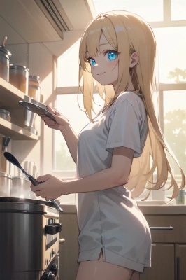 (masterpiece), (best quality),(ultra-detailed),(illustration),(extremely detailed),(perfect anatomy),(super detailed skin),(detailed),(beautiful detailed eyes),1girl,elf,dark skin,dark-skinned female,grey hair,long hair,red eyes,maid,black dress,maid apron,maid headdress,long dress,fishnet pantyhose,, Cooking, smile, blush,from behind,kitchen,side braid,,