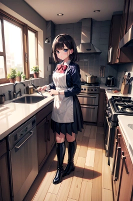 (photorealistic:1.4), (RAW photo), masterpiece, best quality, extremely detailed, wife, knit sweater, leather pinafore, rubber long gloves, medium length hair, neat and clean, smile, staring, cooking, feast, in the kitchen, pot, frying pan,