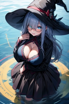 hair over eyes, ((gigantic breast):1.0), witch, witch hat, long skirt, long skirt with deep slit,witch dress with intricate embroidery, long skirt, majestic, realistic, photo realistic, long sleeves, ribbon braided in hair, belt, belt wrapped around the waist, (holding a metal wand),