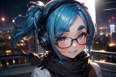 more_details:1.5, meteor shower, shooting stars,glasses, thick eyebrows, short eyebrows, droopy eyes, headphones, scarf, blue hair, side ponytail, smile, loli, child, gigantic breasts, blush, ,mscockpit, cockpit