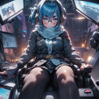 more_details:1.5, meteor shower, shooting stars,glasses, thick eyebrows, short eyebrows, droopy eyes, headphones, scarf, blue hair, side ponytail, smile, loli, child, gigantic breasts, blush, ,mscockpit, cockpit