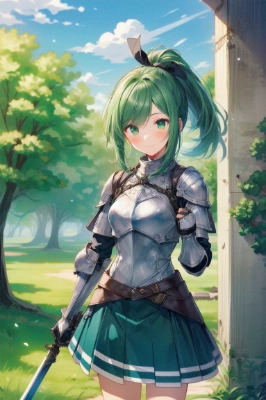 masterpiece, best quality, extremely detailed, anime <lora:hairdetailer:1> <lora:kasshokuhada:1> , a pretty woman, ponytail, green hair, green eyes, big sister, original character, colorful, cyberpunk, panty shot, blushing, smiling、Armory, military uniforms,,