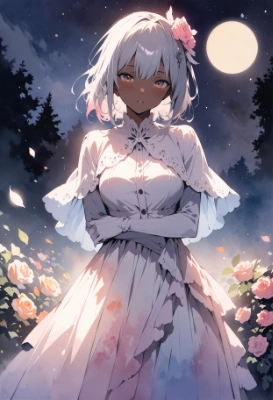 hires,colorful,very aesthetic,absurdres,masterpiece,best quality,2d,illustration,(watercolor_painting:1.4),ephemeral,delicate BREAK english garden,mature_female,slategray hair,(adult face:1.2),(brown_skin:1.1),hair_ornament,dress,capelet,(coquettish posing:1.5),(moonlight:1.2),night,flower_bloom,(rose:1.4),glowing,<lora:Fixhands_anime_bdsqlsz_V1>,