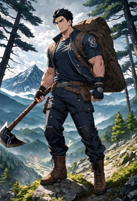 masterpiece, best quality, extremely detailed, anime, 1girl, solo, red shirt, very short hair, black hair, breast pocket, boots, full body, halo, bag, red necktie, short sleeves, forehead, short pants, (((yellow pants))), Thick eyebrows, Round eyes, ,