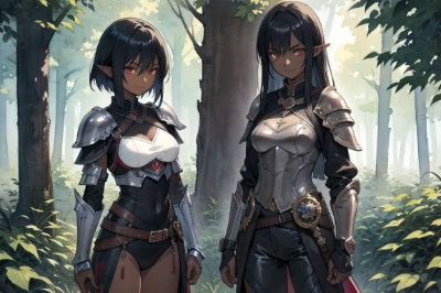masterpiece,best quality,extremely detailed,(watercolor style:1.2),(fantastic style:1.2),2girls,dark_elf,adult,(dark_skin:1.2),slender,black hair,red eyes,medium breasts,leather armor,cool face,cool smile,holding short sword,stylish pose,inside dark forest,