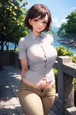 masterpiece, best quality, highres, extremely detailed, beautiful sexy adult woman, short cut, brown hair, wavy hair, low ponytail, emerald eyes, (plump:0.9), medium breasts, shiny skin, collarbone, short sleeves tented shirt, denim tight pants, blush, lips, sweat, earrings, hairpins, looking at viewer, sitting, knee up, holding knee, outdoors, dutch angle, covered penis,