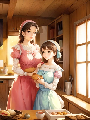long hair, breasts, looking at viewer, blush, smile, bangs, blue eyes, multiple girls, brown hair, hair ornament, long sleeves, dress, holding, 2girls, medium breasts, sitting, closed mouth, collarbone, yellow eyes, flower, frills, food, indoors, hair flower, white dress, window, chair, red dress, table, spoon, underbust