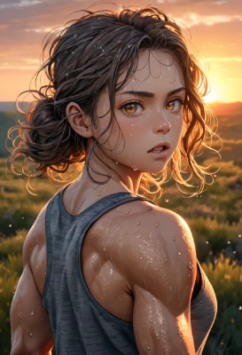(best quality, 8K, textile shading), (ultra detailed face), extremely cute girl, muscularity, (solo:1.2),(from behind:1.3), practice in wild land, sunset, backlighting, (open mouth, exhale deeply, arm up), (tank top:1.3), (sweaty hair and face, steam rising from the body), (looking at viewer), (seriousness), (highly detail face: 1.2), highly detailed eyes, delicate and Beautiful hair,