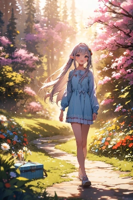 spring,cute 1girl,12yo,(platinum hair),(long straight hair:1.5),elf ear,smooth body,sharp face,small breasts,fashionable,trendy outfit,happy,jewelry,hair ornament,