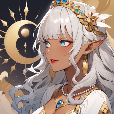 break ,masterpiece, best quality, framed, (detailed beautiful eyes:1.2),high resolution illustration,earrings, from side, portrait, circle, wavy hair, closed mouth, gem, upper body, beads, necklace, smile, flower, lips, sun symbol, dress, contrast, fantasy, parted lips, hair flower, border, pearl ,gemstone, lipstick, abstract, surreal, tarot, looking at another, gold, white dress, shirt, patterned background, facing another, light smile, expressionless, open mouth, feathers, tassel, solo, white shirt, crescent, symbolism, sun, looking away, bead necklace, diadem,,