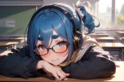 glasses, thick eyebrows, short eyebrows, (droopy eyebrows):1.8, droopy eyes, headphones, scarf, blue hair, side ponytail,