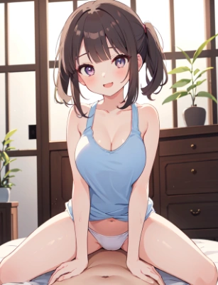 (selphy, girly tanktop, sporty girl:1.2), bare shoulder, (bare navel:0.9), bare thigh, (girly tone, erotic mood:0.8), (undressing, sexual excitement, erotic charm, erogaki smile, temptation:0.8), (hot skin, after training:0.7), love, satisfied, girly room,