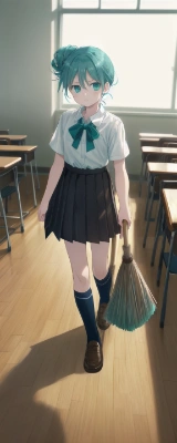 masterpiece, best quality, highres, sisters, 1otoko no ko, solo, school uniform, short sleeve sailor suit, navy blue pleated skirt, navy blue socks, uwabaki, かわいい, flat chest, aqua hair, aqua eyes, middle hair, Hair clip, overjoyed, 13 yo, nice hands, perfect hands, classroom, Touching hair<lora:flat2:0> <lora:hairdetailer:0.5><lora:GoodHands-vanilla:1>