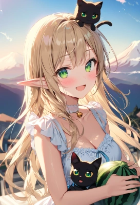 (best quality), (((extremely masterpiece))),(best quality), (extremely detailed),a pretty woman,elf and Black cat,black cat on head, cats,(donut hair ornament),close up on face,spring light blue jacket,flower city,Falling petals,looking at viewer,dream pretty,colorful, spring breeze,spring sunshine,breeze,blush,smile,great joy, :d,Peaceful,choker with bell,The ends of the hair are spread out softly,solo,1 woman, long hair,blonde hair,green eyes,elf, beautiful breasts,ribbon,<lora:hairdetailer:0> <lora:yawanuri:1>,
