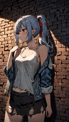 masterpiece, best quality, very aesthetic, absurdres, 1girl, blue silver hair, ponytail, long hair, hair ribbon, red ribbon, red eyes, medium breasts, (torn clothes:1.25), tank top, denim jacket, skirt, wall backgrounds, looking away, darkness, sweatdrops, dark atmosphere, (Shadow of the Monster:1.25),