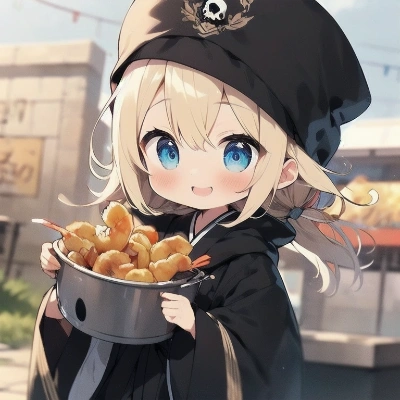 ((TENDON)),(((TENPURA))),((Oil fryer)),((Ebiten)),(((shrimp))),(deep-fried food),smile,morning,Outdoor,Chibi,Baking oven,Japanese clothing,blond hair,Black cloak,Frantic,(((Black Big Cap))),(Skull lesson),large eyes,blue eyes,wind,masterpiece, best quality,ultra-detailed,illustration,beautiful detailed glow,Sling,hood,robe,boy,,,