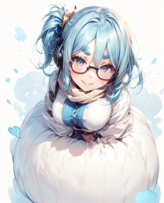,glasses, thick eyebrows, short eyebrows, droopy eyes, headphones, scarf, blue hair, side ponytail, doyagao, ,more_details:-1, more_details:0, more_details:0.5, more_details:1, more_details:1.5