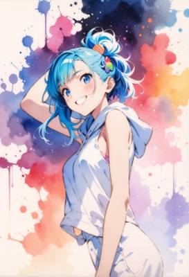 hires,colorful,very aesthetic,absurdres,masterpiece,best quality,2d,illustration,pastel_color,watercolor_painting,delicate BREAK scene from everyday,fantasy,mature_female,blue hair,style seductive,(style funky:1.8),happy,hair_ornament,sleeveless hoodie,headphones,coquettish posing,refreshing,depth of field,<lora:Fixhands_anime_bdsqlsz_V1>,