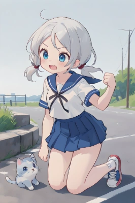 Masterpiece, 8K animation, best quality, perfect anatomical body, 1 girl, solo, ((silver hair, short hair, twin tails, very long sideburns, parted bangs, ribbon headdress, red)), blue eyes, cute face, big smile, open mouth, small breasts, short height, (sailor suit, short sleeves), (sailor suit skirt, dark blue), (wearing white panties), sneakers, (kneeling), (knees spread), (kitten is surprised, jumping up), clenching fist, punching ground, ground cracks, road background. , ,, <lora:flat2:0.35> <lora:hairdetailer:0.85> ,