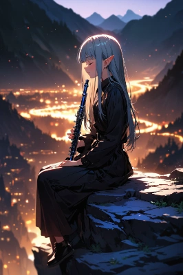 (play Trumpet:1.1),outdoor,On top of a cliff,a large mountain in the distance,99 balloons,