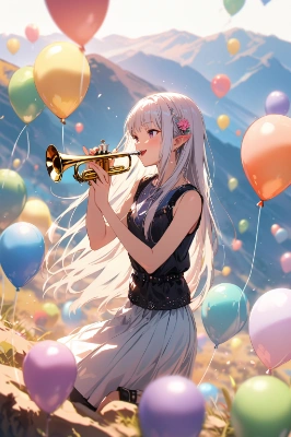 (play Trumpet:1.1),outdoor,On top of a cliff,a large mountain in the distance,99 balloons,