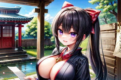 1woman, long hair, black hair, purple eyes, kimono, hair bow, starry sky, huge breasts, kyoto, full moon, japanese, fantasy, the landlady, smile <lora:hairdetailer:1> <lora:eyecolle_colchicum_v100:1> ,