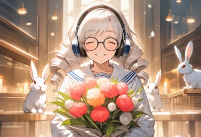 (masterpiece, best quality, extremely detailed, anime,super fine illustration, beautiful hand),(((cyberpunk, night city view))), (((solo girl))), ((white hair, long drill hair)), original character, colorful kaleidoscopic colors, (Thick-rim glasses, headphone:1.3) , ((holding SSD and HDD hardware)), (upper body , front shot, facing to viewer:1.5), fireman jacket, white rabbits,<lora:flat1:-0.65> <lora:lightline:1>,